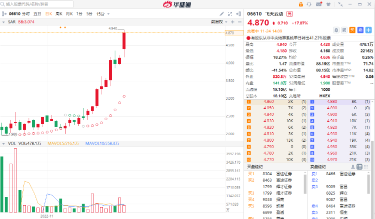 华盛资讯11月24日消息,飞天云动延续近期涨势,午后涨超17%,盘中一度触及4.94港元再创新高,自上市以来累计涨幅约121%。截至发稿,涨17.07%,报4.87港元,成交额2216万港元。