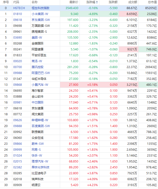 科网股涨跌互现,快手继昨日公布财报后连续2日上涨,当前涨幅2.07%;网易-S涨1.83%,百度涨1.51%,哔哩哔哩涨1.07%,阿里巴巴-SW、腾讯控股转跌,京东跌3.23%,小米跌4.69%,Q3净利润腰斩;美团跌超2%。