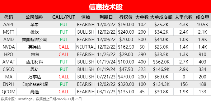 - 苹果 $AAPL 出现12月2日到期、行权价为150美元的PUT大单异动。Wedbush分析师Daniel Ives发表研报表示,在至关重要的黑色星期五周末,苹果 $AAPL iPhone 14手机的需求超过了供应,但是因为供应不足,预计iPhone的销量将从上年同期的1000万部下降到约800万部。