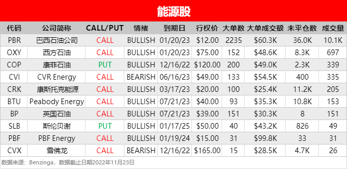 - 巴西石油公司 $PBR 现2023年1月20日到期、行权价为12美元的看涨期权大单。不过该股此前遭瑞银大砍53%目标价,瑞银分析师认为该公司“发展方向即将发生转变”,于近日将对其评级从“买入”下调至“卖出”,目标价从18.1美元下调至8.5美元。