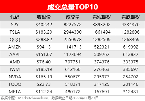 - 3倍做多纳指ETF $TQQQ 期权成交总量上榜Top 10,沽购比约0.63。Meta继续上榜Top 10,看跌期权总数远超看涨期权,沽购比达到1.86。