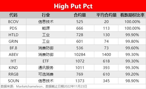 - 当日Put单比率达到100%的个股或ETF有2只,正值世界杯比赛期间,拉丁美洲最大的啤酒生产商、世界第四大啤酒生产商安贝夫集团 $ABEV 看跌期权比率却达到99.3%。