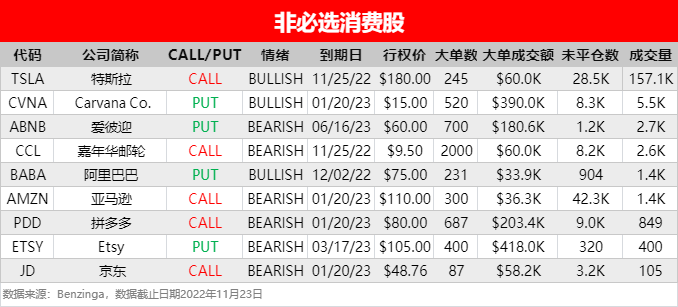 - 爱彼迎 $ABNB 出现2023年6月16日到期、行权价为60美元的看跌期权大单。据报道,公司内部人士Catherine C. Powell在本周二(11月22日)卖出约5054股,售出均价为93.66美元。