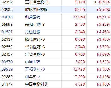 部分医药股走高,三叶草生物盘中暴拉,午盘涨16.7%,和黄医药涨超5%,腾盛博药涨4%,开拓药业涨3.5%,康希诺涨2%。