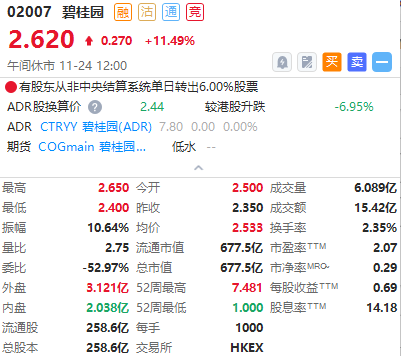 11月24日消息,11月23日国常会上提及降准,“金融16条”正式向市场“揭开面纱”,今日港股恒指高开后盘中涨幅有所收窄,截至午盘,恒指涨0.52%,报17614.3点,碧桂园暴涨11.5%,领涨蓝筹。