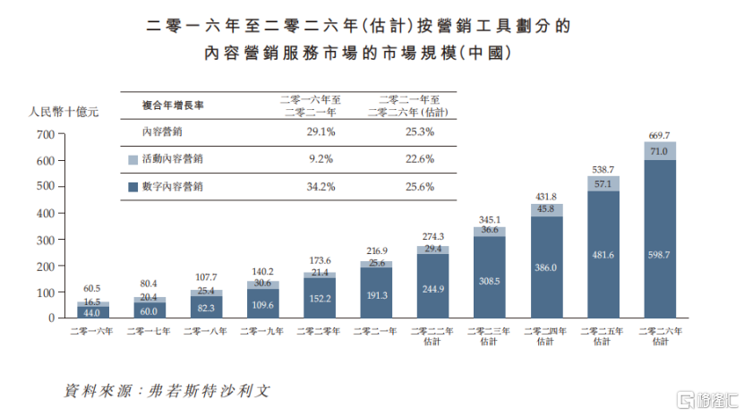 多想云务覆盖上述五大业务领域,有望充分享有国内营销服务市场的持续增长,尤其是在内容营销,属于增长最快千亿级细分赛道。根据弗若斯特沙利文资料显示,2016-2021年,中国内容营销市场规模年复合增长率达29.1%,预计2021-2026年将达25.3%。