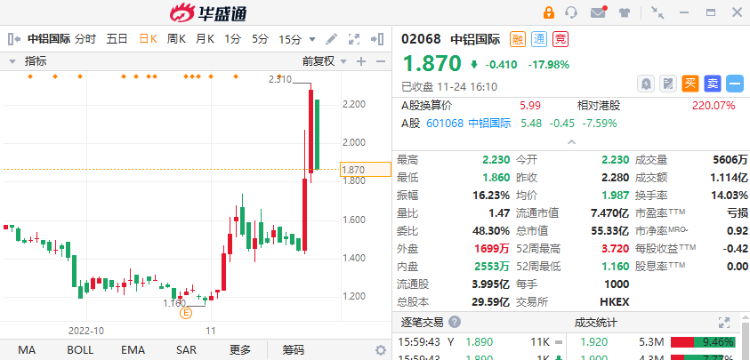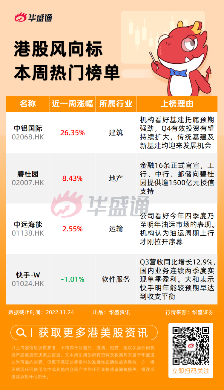 1、中铝国际 $02068.HK 周涨26.35%,安信证券表示基建托底预期强劲,Q4有效投资有望持续扩大,传统基建及新基建均迎来发展机会;
