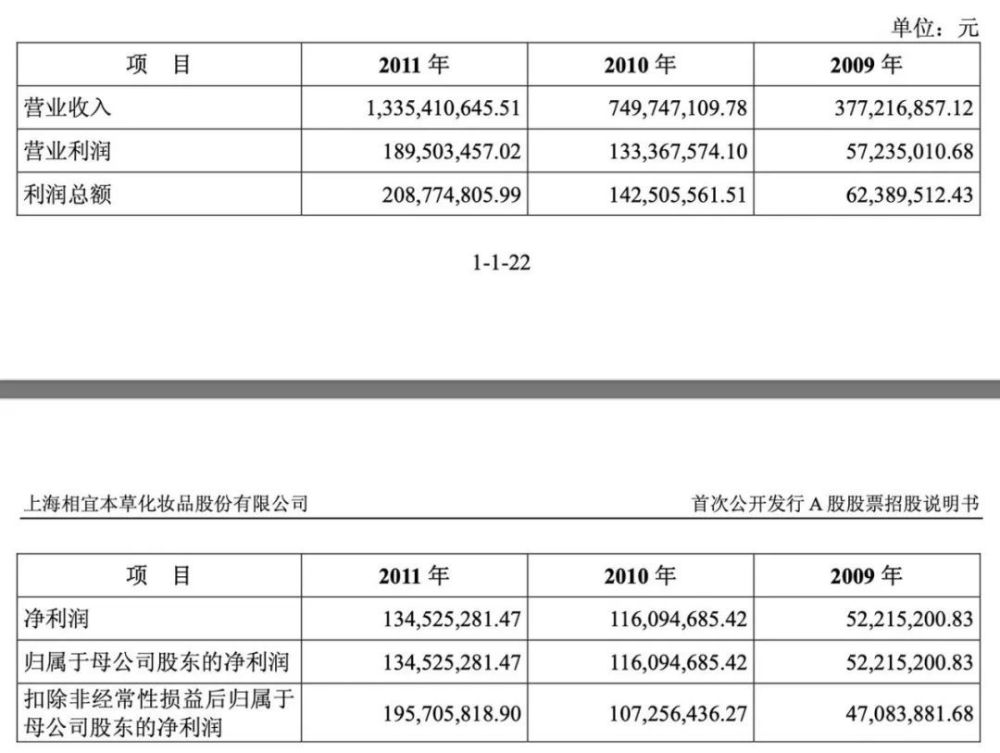 彼时,相宜本草正大步迈入“黄金时代”。据公开数据,早在2008年,相宜本草的销售额就达到2.17亿元。其招股书显示,2009-2011年,相宜本草实现营业收入3.77亿元、7.5亿元、13.35亿元,除了营收的翻倍式增长,公司的净利润也与日俱增,报告期内实现净利润5221.52万元、1.16亿元和1.35亿元,毛利率分别为78.65%、79.87%、80.34%。