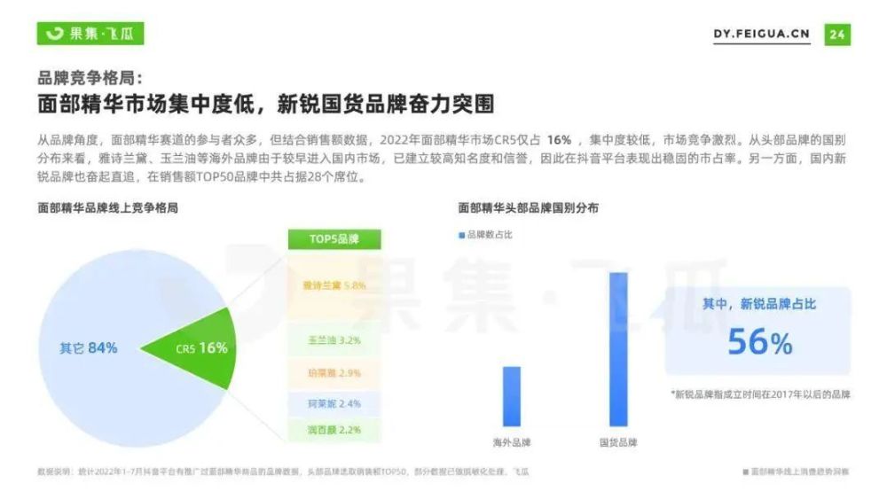 数据则更为直观,据“果集·飞瓜”2022年出品的《面部精华线上消费趋势洞察》,“从品牌角度,面部精华赛道的参与者众多,但结合销售额数据,2022年面部精华市场CR5仅占16%,集中度较低,市场竞争激烈”。
