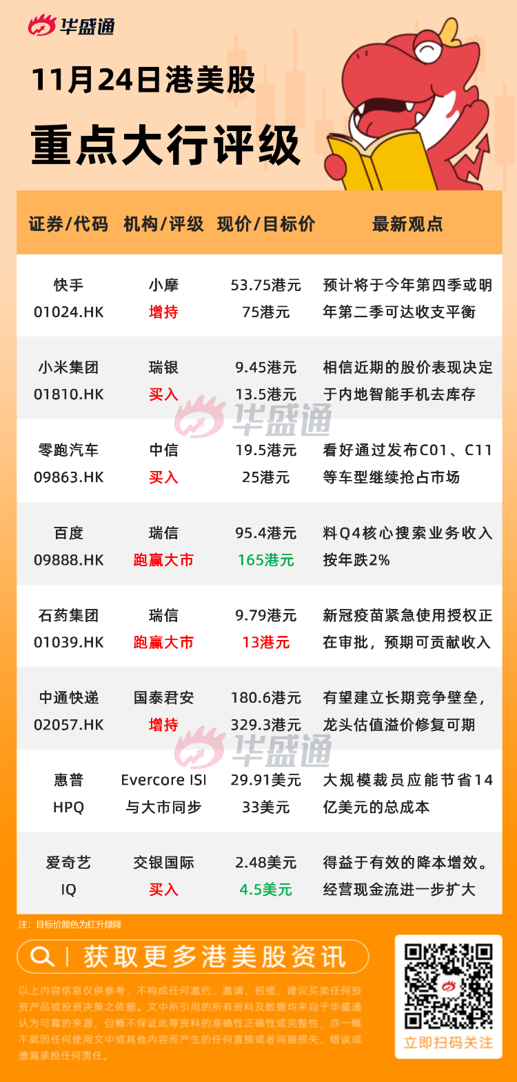 小摩发布研究报告称,维持快手-W“增持”评级,对明年收入预测大致不变,目标价75港元,较当前股价有40%的上升空间。该行认为快手的收支平衡指日可待,预计将于今年第四季或明年第二季可达收支平衡,明年下半年或2024年上半年的内地业务经营利润率可达双位数。