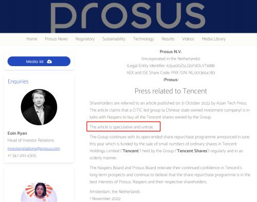 11月1日,南非报业集团Naspers在官网发出声明称,对于“中信集团正在与Naspers进行谈判,以收购Naspers持有的所有腾讯股份”的消息,是推测性的,不真实的。