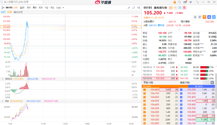 11月25日消息,港股康希诺生物直线拉升,盘中一度涨近10%,早盘跌超5%;现涨7.4%,报105.2港元每股,成交额3.12亿港元。