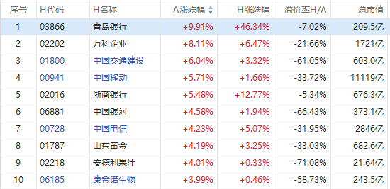 截至A股收盘,AH股涨幅前10如下: