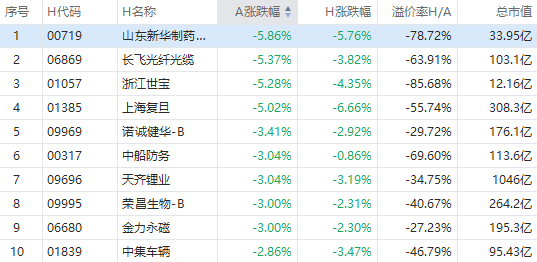 截至A股收盘,AH股跌幅前10如下: