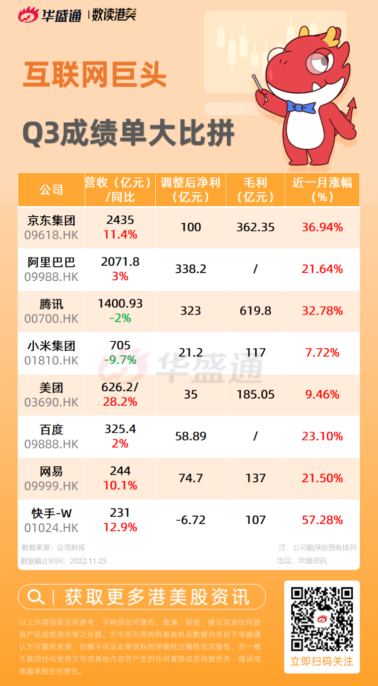 本周伴随着快手 $01024.HK 、百度 $09888.HK 、小米 $01810.HK 、美团 $03690.HK 陆续公布业绩,港股的财报季也即将进入尾声!此前腾讯 $00700.HK 、阿里 $09988.HK 、京东 $09618.HK 等已分别交出自己的Q3“成绩单”。总体来看,腾讯Q3重回盈利增长通道,京东、网易 $09999.HK 等业绩胜过预期。