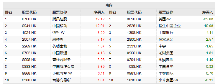 南下资金本周加仓腾讯、中国移动、快手-W、碧桂园;抛售美团、工商银行