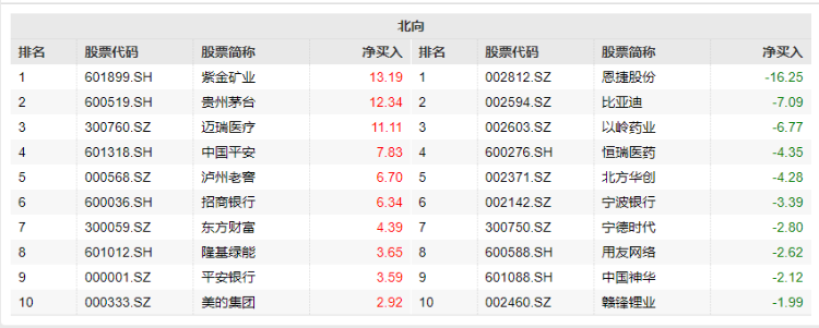近7天,北上资金买入金额最多的标的为紫金矿业,一周净买入13.19亿元,贵州茅台获净买入12.34亿元,迈瑞医疗获净买入11.11亿元;
