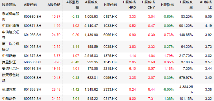 个股方面,沪股通中,京城机电股份、中石化油服、中信建投证券、第一拖拉机股份、中州证券等个股位列溢价榜前列;