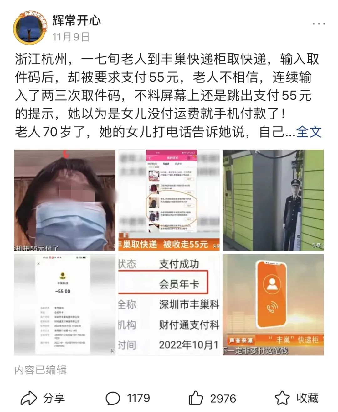 据媒体报道,浙江省杭州市一位七旬老人到丰巢快递柜取快递,输入取件码后,却被要求支付55元,她以为是女儿没付运费就手机付款了,但随后老人了解到,女儿早已支付运费。