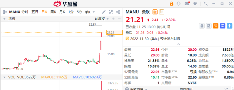 在曼联(MANU,股价21.21美元,市值35.11亿美元)的所有者格雷泽家族正式表示有意向出售球队后,当地时间11月25日,曼联收涨13.35%,盘中一度涨逾22%,创下2018年10月以来新高,同时本周累计上涨更是超过62%,市值增加约13亿美元。
