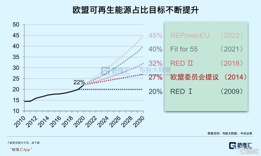 号称将会为欧洲提供廉价、安全和可持续的能源,将2030年的可再生能源目标从当前的40%提高到45%,预计在2030年前使可再生能源总装机量达到1236GW。