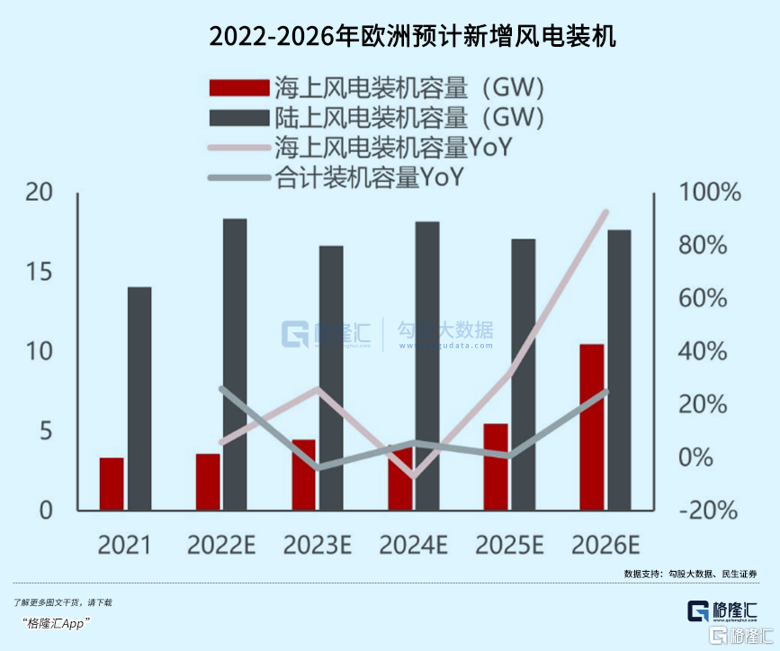比如,今年5月,欧盟公布了“REPowerEU”行动计划,将可再生能源比例目标上调至45%,同时计划2030 年风电累计装机480GW。