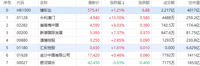 华盛资讯11月28日消息,港股博彩股部分走高,永利澳门涨13.3%,美高梅中国涨9%,新濠国际发展涨超7%,澳博控股涨超2%;金沙中国跟涨;银河娱乐微跌。