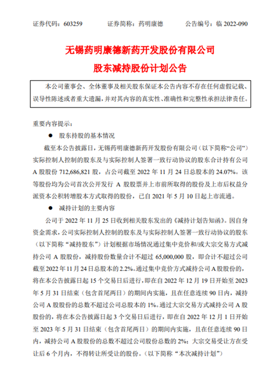 根据药明康德A股的公告,该公司于2022年11月25日收到相关股东发出的《减持计划告知函》。因自身资金需求,公司实际控制人控制的股东及与实际控制人签署一致行动协议的股东,计划根据市场情况通过集中竞价或大宗交易方式减持公司A股股份,减持股份数量合计不超过6500万股,即合计不超过公司截至2022年11月24日总股本的2.2%。