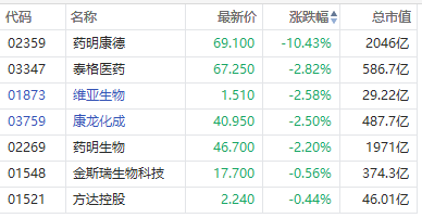 11月28日讯,今日医药外包概念股大幅走低,其中药明康德现跌超9%,早盘一度跌超10%;成分股康龙化成、药明生物跌超2%。