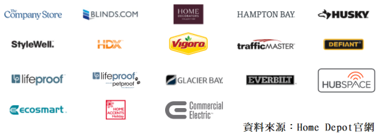 集团除了Home Depot品牌,还会透过其他专有品牌出售商品,例如HDX、Husky、Hampton Bay、Home Decorators Collection、Glacier Bay、Vigoro、Everbilt和 Lifeproof等。