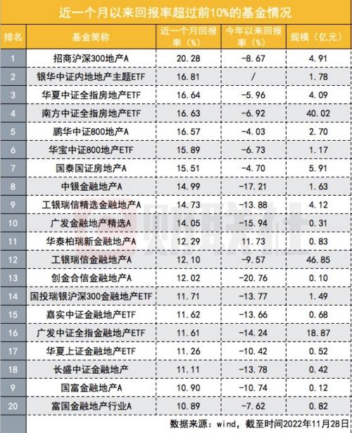 “春江水暖鸭先知”,政策大利好已经在基金上有所表现。Wind数据显示,进入11月以来,截至11月28日,全市场“地产”主题基金全线收正,20只基金月内涨幅超过10%。其中,招商沪深300地产回报率超过20%,年内回报率亏损收窄至8.67%。