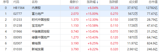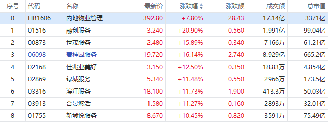 11月29日,港股物管及内房股早盘走强,融创服务涨超20%,碧桂园服务涨16.14%,富力地产涨15%,碧桂园涨9.25%。