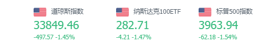 道指周一收跌497.57点,跌幅为1.45%,报33849.46点;纳指跌176.86点,跌幅为1.58%,报11049.50点;标普500指数跌62.18点,跌幅为1.54%,报3963.94点。苹果公司收跌2.63%,拼多多收高12.62%,Shopify收高3.37%。