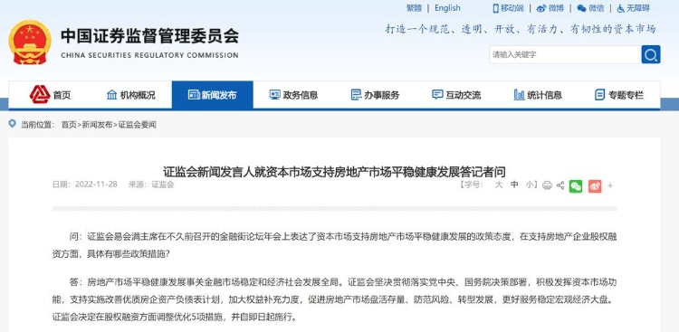 11月28日,据证监会发布,恢复涉房上市公司并购重组及配套融;恢复上市房企和涉房上市公司再融资;调整完善房地产企业境外市场上市政策;与境内A股政策保持一致,恢复以房地产为主业的H股上市公司再融资等五项举措。