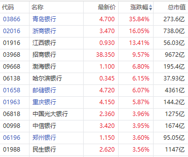 11月29日讯,港股内银股早盘拉升走高,青岛银行现涨超35%,浙商银行涨超16%,江西银行涨超13%,招商银行涨超9%。