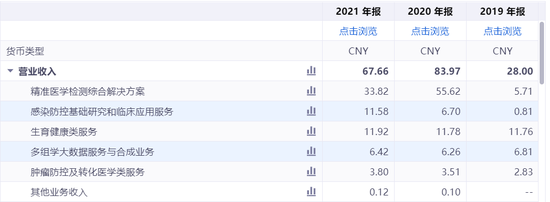 进入到2021年,随着疫情缓解,华大基因“火眼”实验室的建设速度放缓,收入贡献相应下滑。其中,公司精准医学检测综合解决方案收入大幅缩水至33.82亿元,同比降幅为40%。与此同时,由于部分地区疫情防控的影响,华大基因常规业务增加较为缓慢,其中生育健康基础研究和临床应用服务、肿瘤防控及转化医学类服务收入保持微幅增长,而多组学大数据服务与合成业务则出现同比下滑。