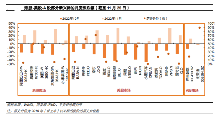 11月自底部大幅反弹,“一体两翼”后国企迎来估值修复。伴随着10月底利空情绪的充分释放,加上11月全球金融市场在美元与美债利率下行的背景下出现显著反弹,港股市场在多重利好叠加出现的情况下迎来了触底后的大幅反弹行情。