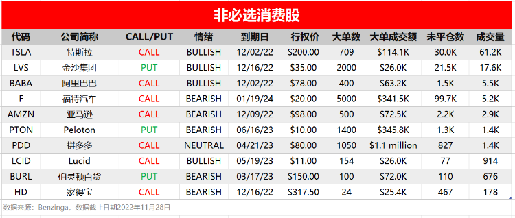 周一(11月28日),非必选消费、信息技术和医药板块相关个股出现较多活跃单,按照当日成交量排行,榜单TOP分别如下: