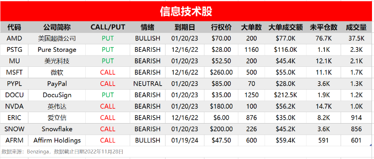 - 企业数据储存服务商Pure Storage现12月16日到期的看跌期权大单,成交1160张,总金额11.6万美元,周一期权成交量增至1.84万,前值约2200张。