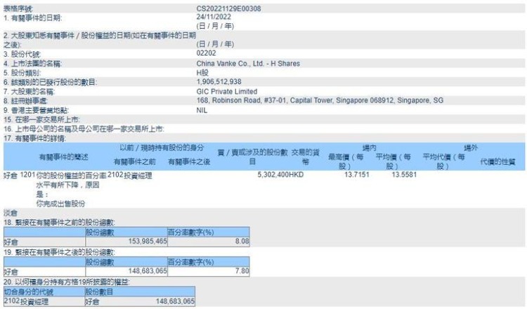 11月29日,根据香港交易所的公告,万科股东GIC Private Ltd. 于11月24日以平均每股13.5581港元卖出了约530万股万科港股股票,持股比例从8.08%降至7.8%。交易价值约7,190万港元。