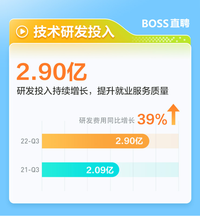 通过加大产研投入不断优化用户体验与人岗匹配效率,是BOSS直聘获取用户增长、保持用户粘性、发挥促就业价值的核心因素。三季度,BOSS直聘投入研发费用2.90亿元,同比增长39%。此前公开的信息显示,截至2022年6月30日,BOSS直聘研发团队近1400人。