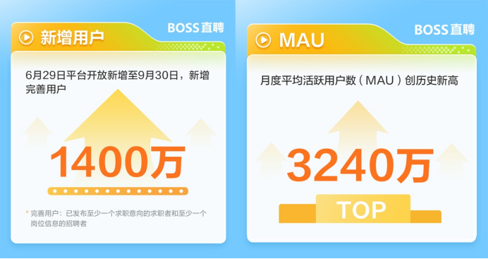财报显示,三季度BOSS直聘MAU达3240万,环比增长22%,创历史新高。三季度BOSS直聘新增完善用户达1400万人,对比之前截至8月15日的约800万累计新增完善用户数,保持了良好的增长态势。完善用户指发布了至少一个求职意向的求职者或发布至少一个岗位信息的招聘者。