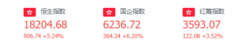 截至周二收盘,恒指收复一万八关口涨5.24%,报18204.68点;国企指数涨6.20%,红筹指数涨3.52%;恒生科技指数涨7.66%,万国数据涨18%,哔哩哔哩涨13.60%,京东集团涨近11%。
