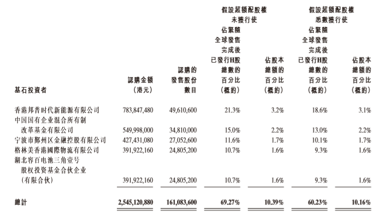 按发售价每股发售股份15.80港元,基石投资者已合共认购161,083,600股发售股份﹐合共估本公司股本总额10.39%(于任何超额配股权获行使前)及全球发售项发售股份数目约69.27%(于任何超额配股权获行使前)。