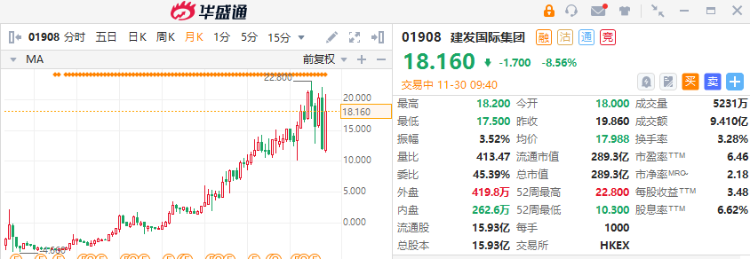11月30日讯,建发国际集团(01908)早盘跌超8%,公司发布公告,拟折让约9.47%先旧后新配售4500万股,净筹约8亿港元。