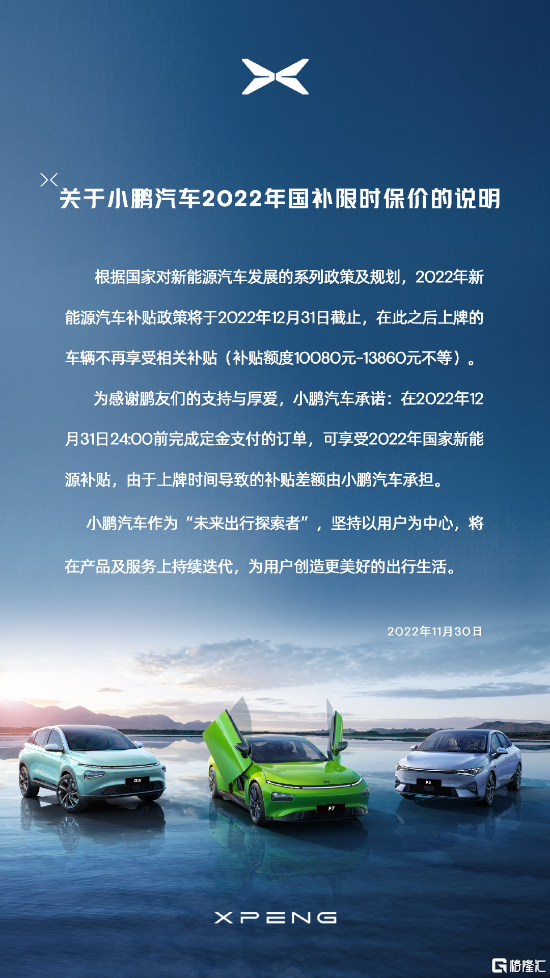 除比亚迪外,今日,小鹏汽车推出限时保价政策,在12月31日前完成定金支付的订单,将持续享受2022年国家新能源补贴,不受交付时间影响。