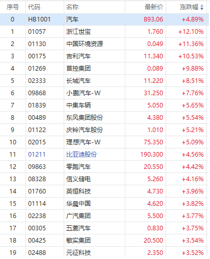 受上述传闻影响,午后港股汽车股涨幅扩大,吉利汽车涨10%,长城汽车涨超8%,小鹏汽车涨7.75%,五菱汽车涨5%,理想汽车涨4.6%,比亚迪股份涨4.56%。汽车配件板块也大涨。