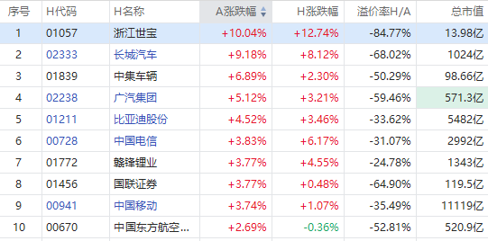 截至发稿,浙江世宝A股涨停,港股涨12.74%;长城汽车A股涨9.18%,港股涨8.12%;比亚迪股份A股涨4.52%,港股涨3.46%。