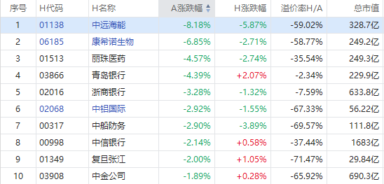 中远海能A股跌8.18%,港股跌5.87%;康希诺生物A股跌6.85%,港股跌2.71%;中旅国际A股跌2.92%,港股跌1.55%。