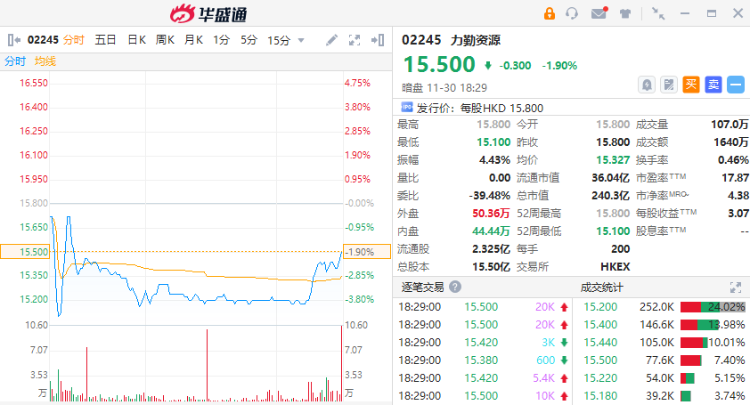 华盛资讯11月30日讯,镍矿龙头企业力勤资源 $02245.HK 暗盘收跌1.90%,最新总市值超240亿港元。该股预计将于明日(12.01)正式港股挂牌上市。